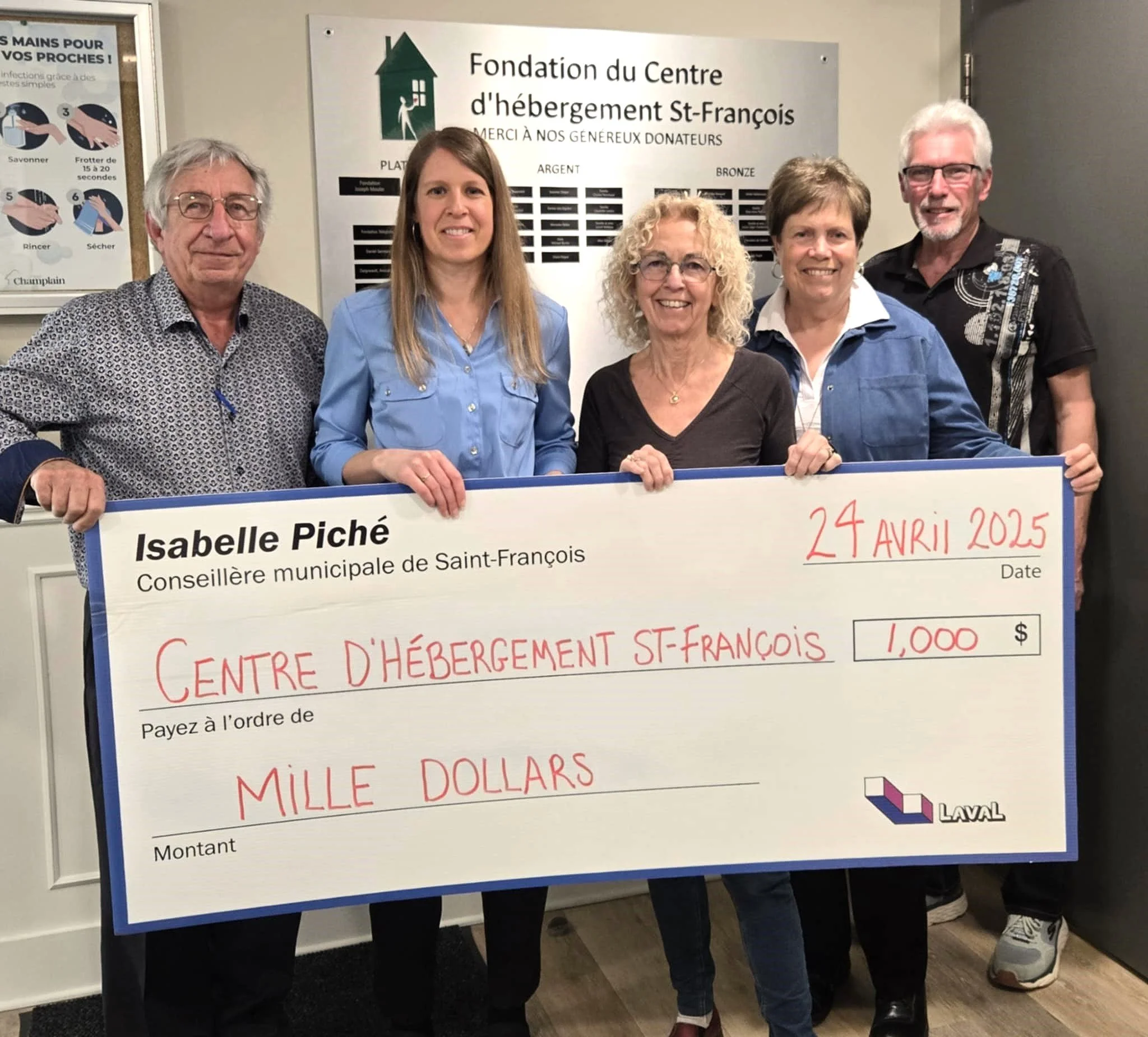 Laval, le 22 mai 2025 ── La conseillère municipale du district Saint-François pour Action Laval, Madame Isabelle Piché, a remis le 24 avril dernier un chèque de 1 000 $ à la Fondation du Centre d’hébergement Saint-François afin de l’aider à poursuivre sa mission. La Fondation qui existe depuis plus de 25 ans sera ainsi en mesure d’améliorer la qualité de vie des résidents par le biais d’activités et d’animation.